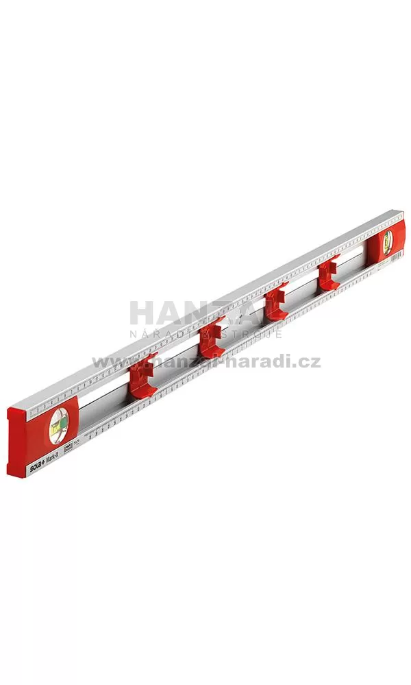 Provedení: Z hliníku, profil C s posuvnými měřítky, potažená. Natištěné měřítko nulového bodu a měřítko středového bodu pro symetrická měření. Přesnost měření v běžné poloze 0,75 mm/m.