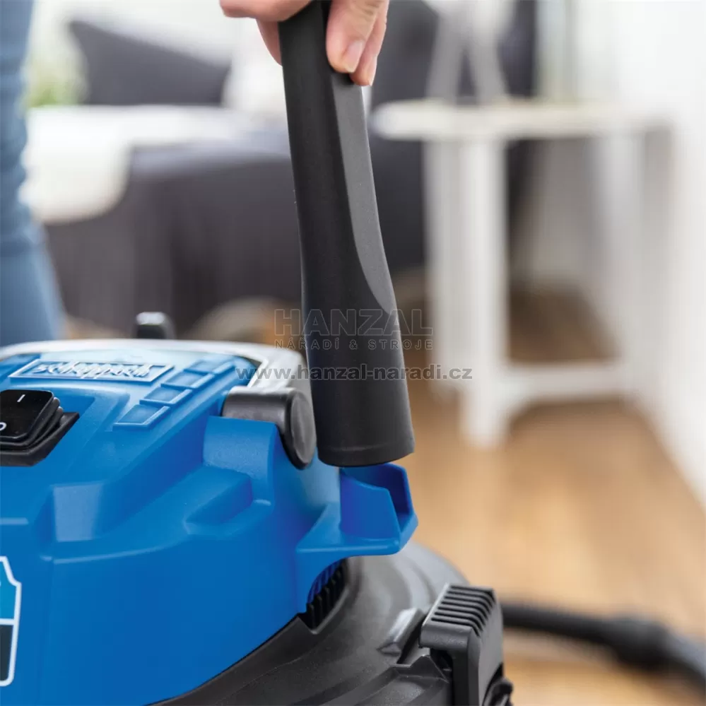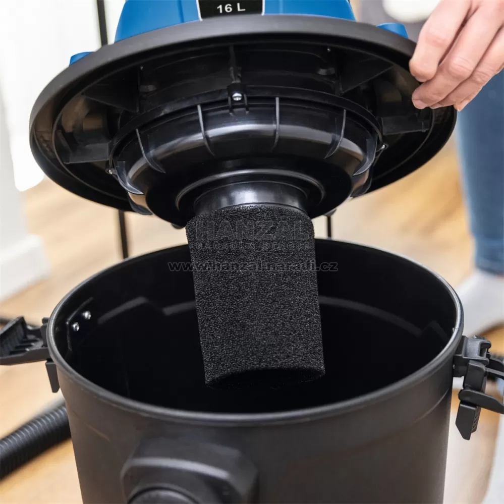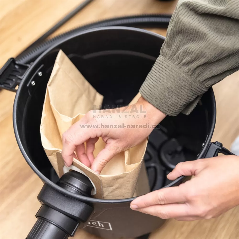 Odolná, nerozbitná plastová nádoba o objemu 16 litrů je vybavena praktickým rychloupínacím zámkem, který umožňuje snadnou výměnu sáčku. Velký pracovní dosah zajišťuje třímetrový napájecí kabel a 1,8 m dlouhá hadice, takže se pohodlně dostanete i do vzdálenějších koutů.