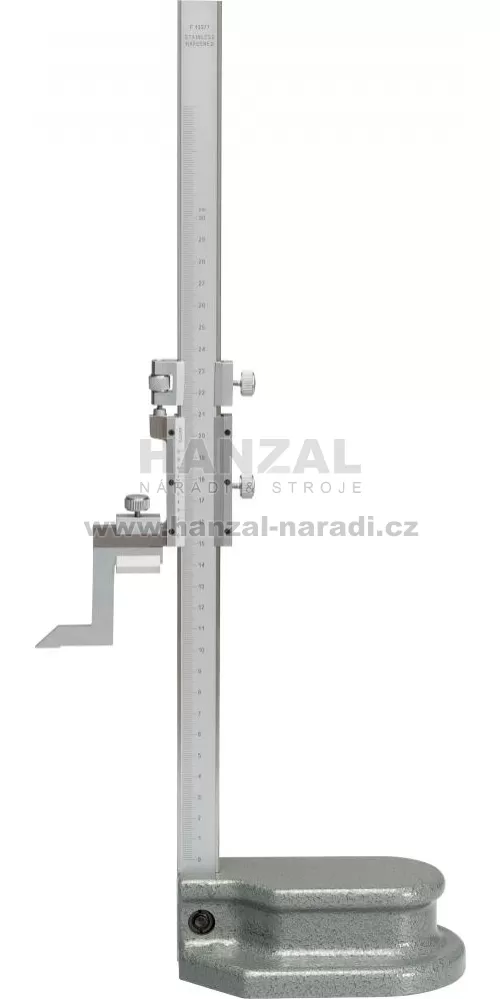 Provedení: Se silným podstavcem a broušenou podstavcovou plochou. Nonius a stupnice matně chromované. S jemným nastavením, aretačním šroubkem a výměnnou rýsovací jehlou z tvrdokovu. Dodáváme v přepravním kufříku.